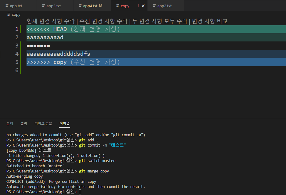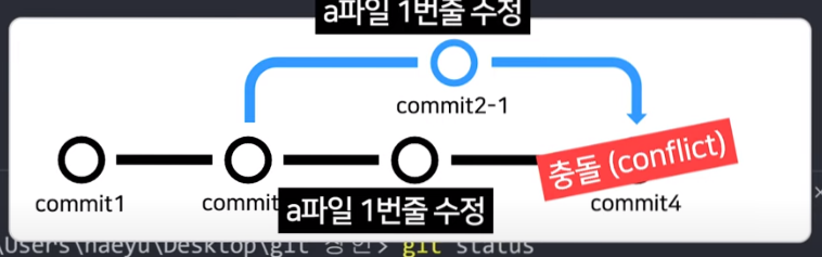 똑같은 파일에 똑같은 줄을 수정하는 경우 충돌이 발생한다. 이런 것들은 직접 해결해 주어야 한다.