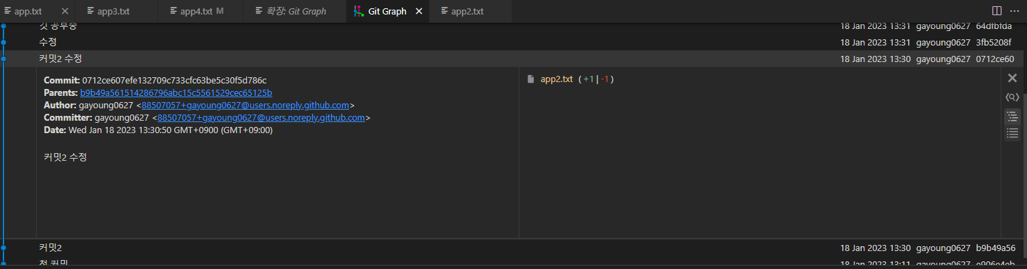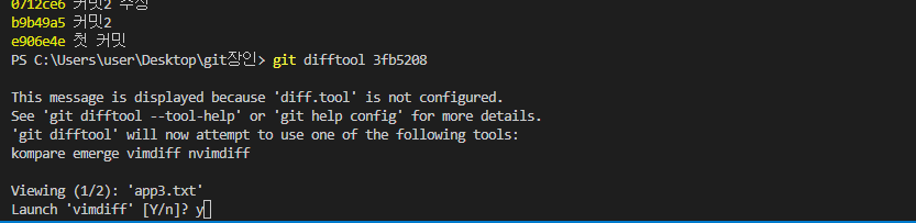 git difftool 커밋아이디1 커밋 아이디2 명령어는 특정 커밋과 특정 커밋을 비교할 수 있다.