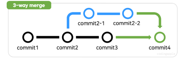 : 모든 branch를 3-way merge하는 경우 3-way merge된 것들이 매우 복잡해 보일뿐만 아니라 master(main) branch에서 보면 3-way merge된 branch들의 commit 내역도 모두 출력되어 지저분해보인다.