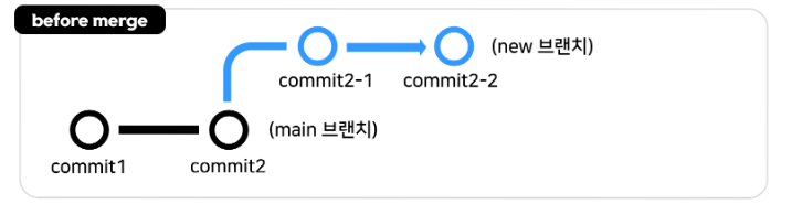 : 아래와 같이 새로운 branch에만 commit이 있고 기준이 되는 브랜치에는 신규 commit이 없는 경우
