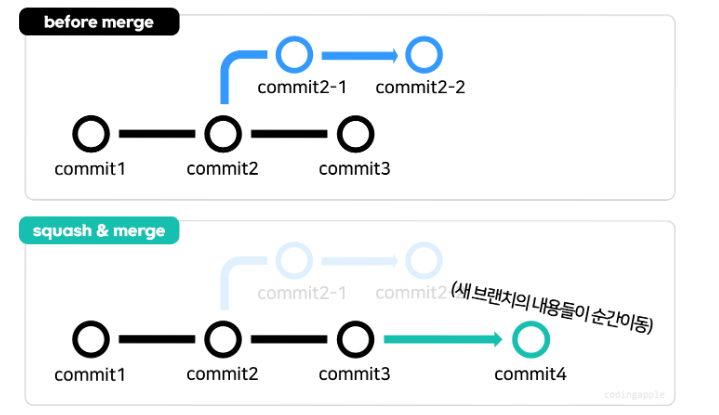 squash and merge 하는 법은 간단하다. --squash 옵션만 추가해주면 끝이다.