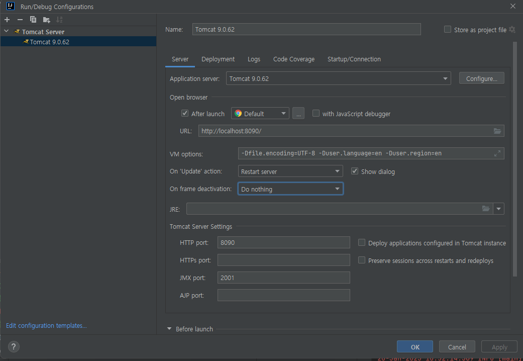 * 만약 톰캣 로그창에 한글이 깨져 나온다면 VM options에 -Dfile.encoding=UTF-8 -Duser.language=en -Duser.region=en 을 추가 해주자