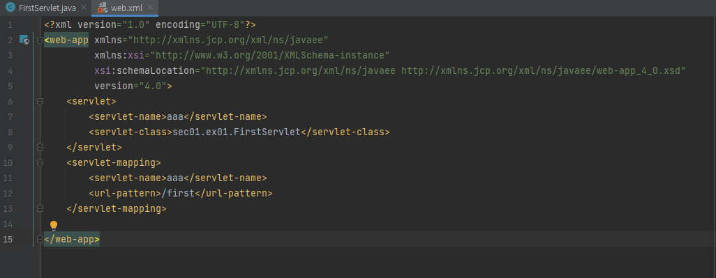 아래의 코드를 보게 되면 <servlet-name> 태그의 값을 같은 값으로 설정해 <servlet>과 <servlet-mapping>을 연결해주었다.