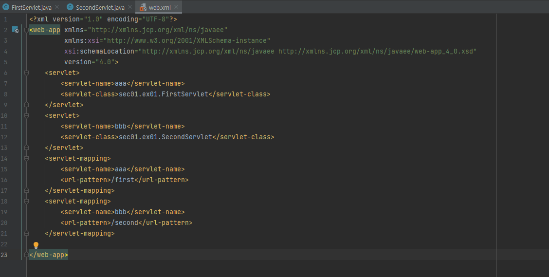 여러 개의 서블릿을 매핑 시 <servlet> 태그 먼저 정의하고 <servlet-mapping> 태그를 정의해야 한다.