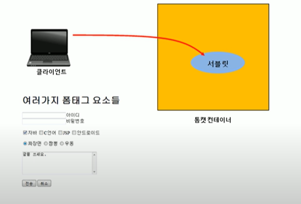 - 웹 브라우저에서 여러 가지 입력 서식을 이용해 전송을 클릭하면 사용자가 입력한 데이터가 Servlet으로 전송