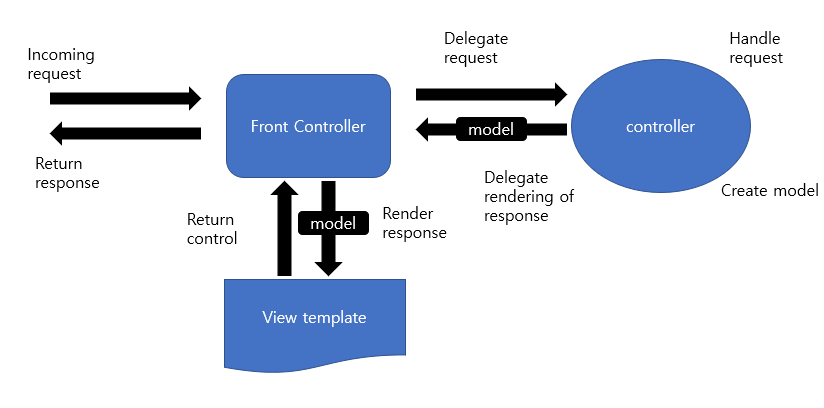 - 프론트 컨트롤러가 사전/사후에 대한 처리를 하게 되면 중간에 매번 다른 처리를 하는 부분만 별도로 처리하는 구조를 만든다 → 스프링에서는 이를 controller라고 함