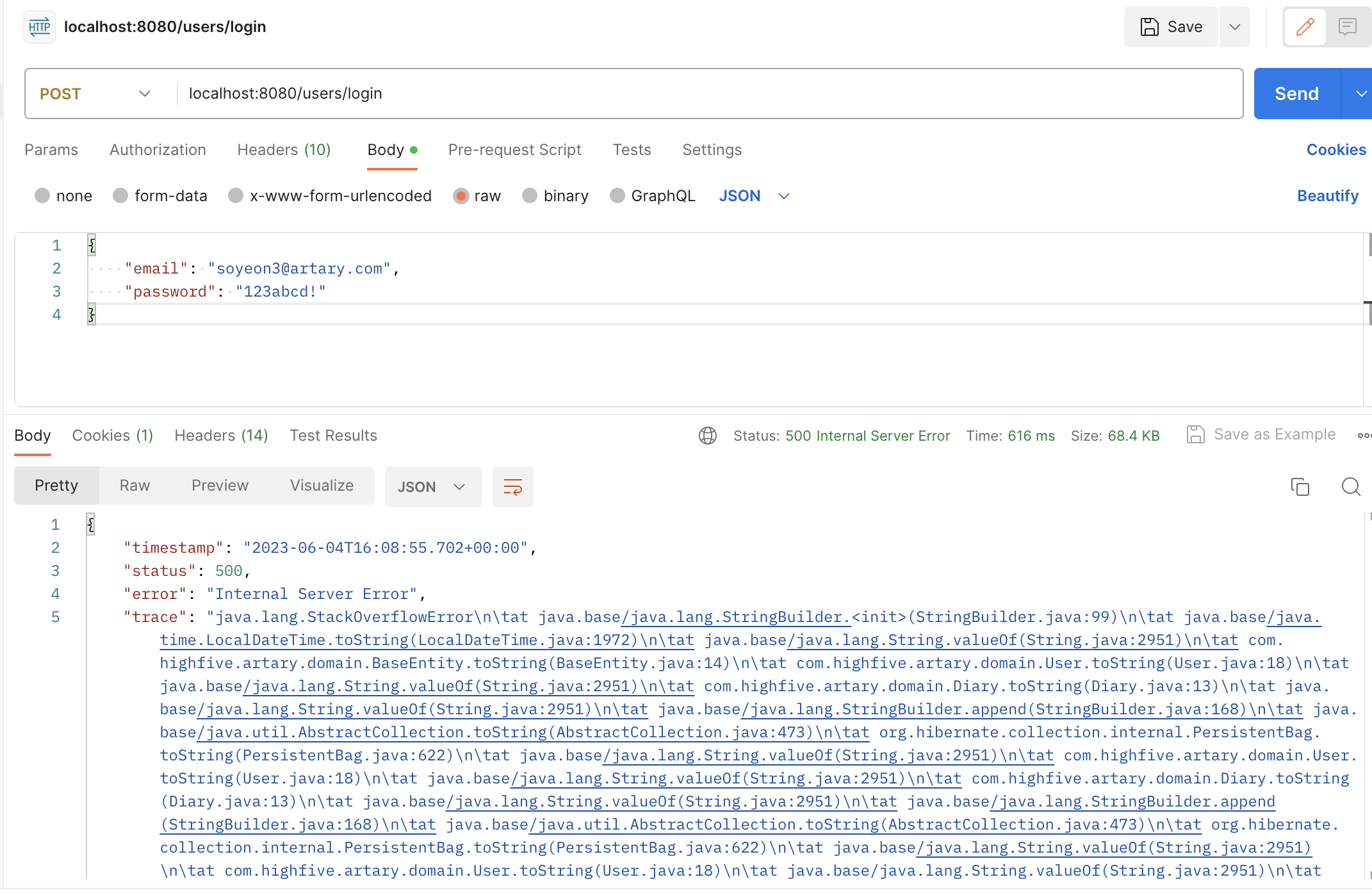 팀원한테 포스트맨의 오류 메세지를 보내달라 그랬고 오류를 읽어본 결과 스택오버플로우임을 확인할 수 있었다. 그래서 스택오버플로우에 대해 구글링을 한 결과 lombok의 ToString 어노테이션 때문임을 알 수 있었다. JPA에서 객체간의 양방향 관계인 경우 두 객체가 서로를 인스턴스 멤버로 가지고 있기 때문에 서로 참조를 하기 때문에 StackOverflowError가 발생한 것이다.
